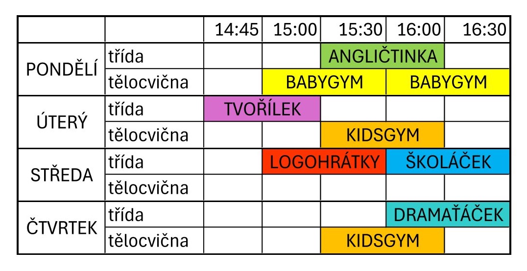 - osvědčený kroužek předškolní přípravy pro děti nastupující do školy s vlastním pracovním sešitem a ověřenou metodikou, 10 lekcí 1x týdně, více informací ZDE